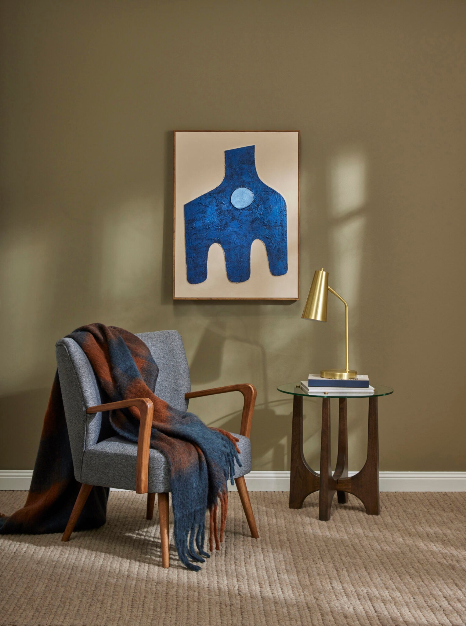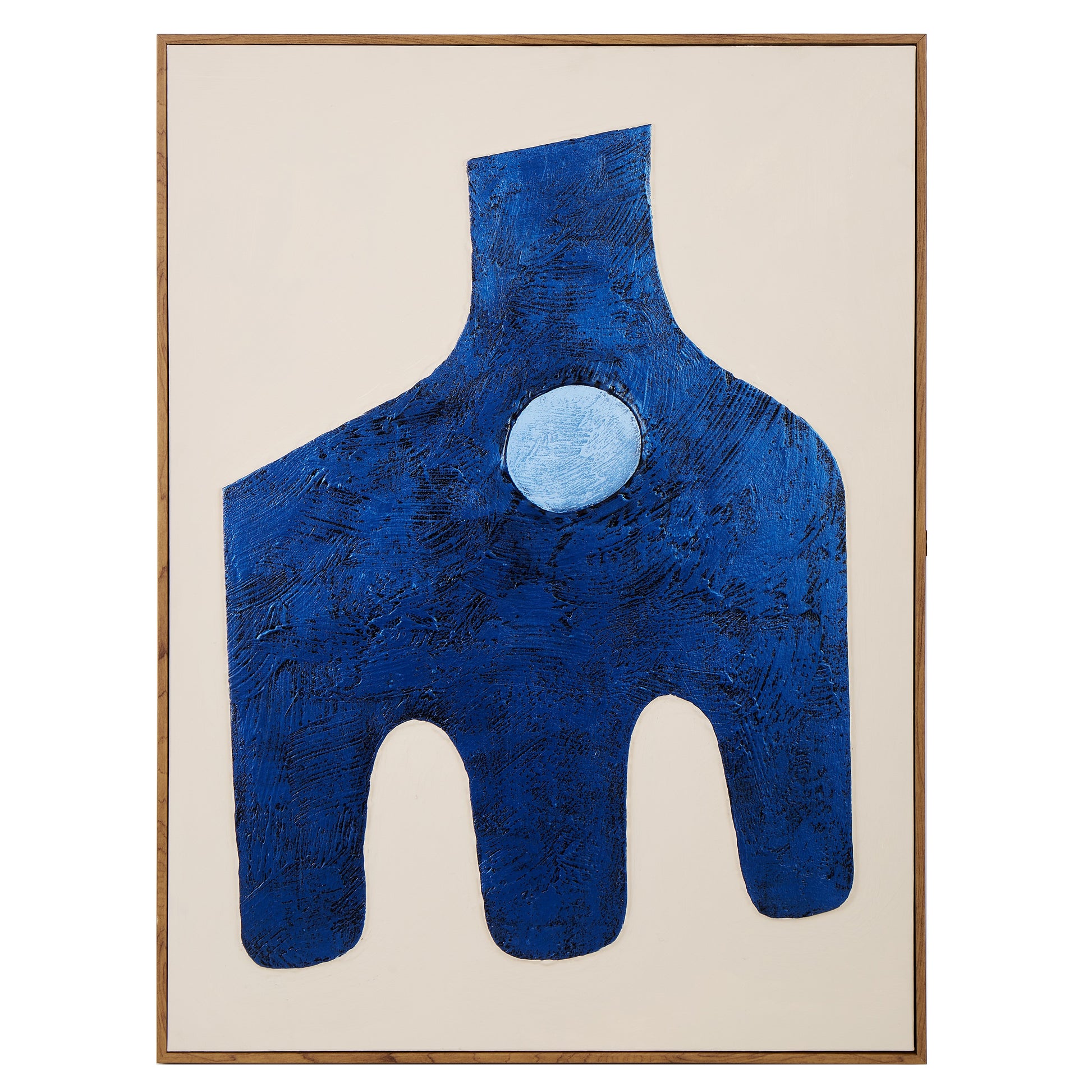 This Ezra Hand Painted Wall Art features a hand-painted blue abstract design in a pine wood frame, inspired by Mid-Century Modern aesthetics.
